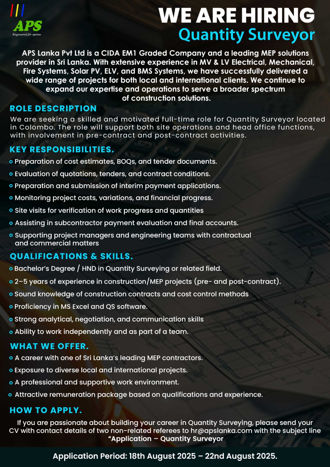 If you are passionate about building your career in Quantity Surveying, please send your CV with contact details of two non-related referees to hr@apslanka.com with the subject line “Application – Quantity Surveyor”.